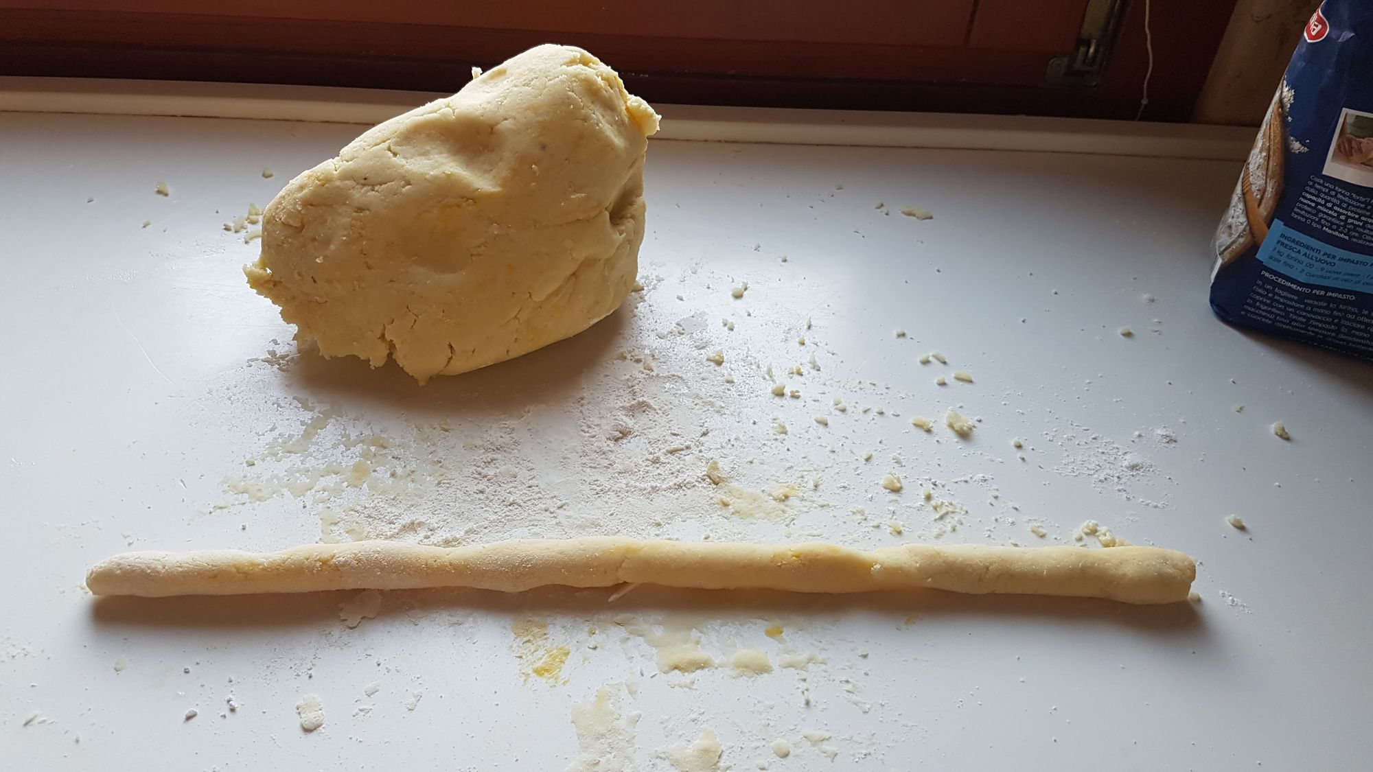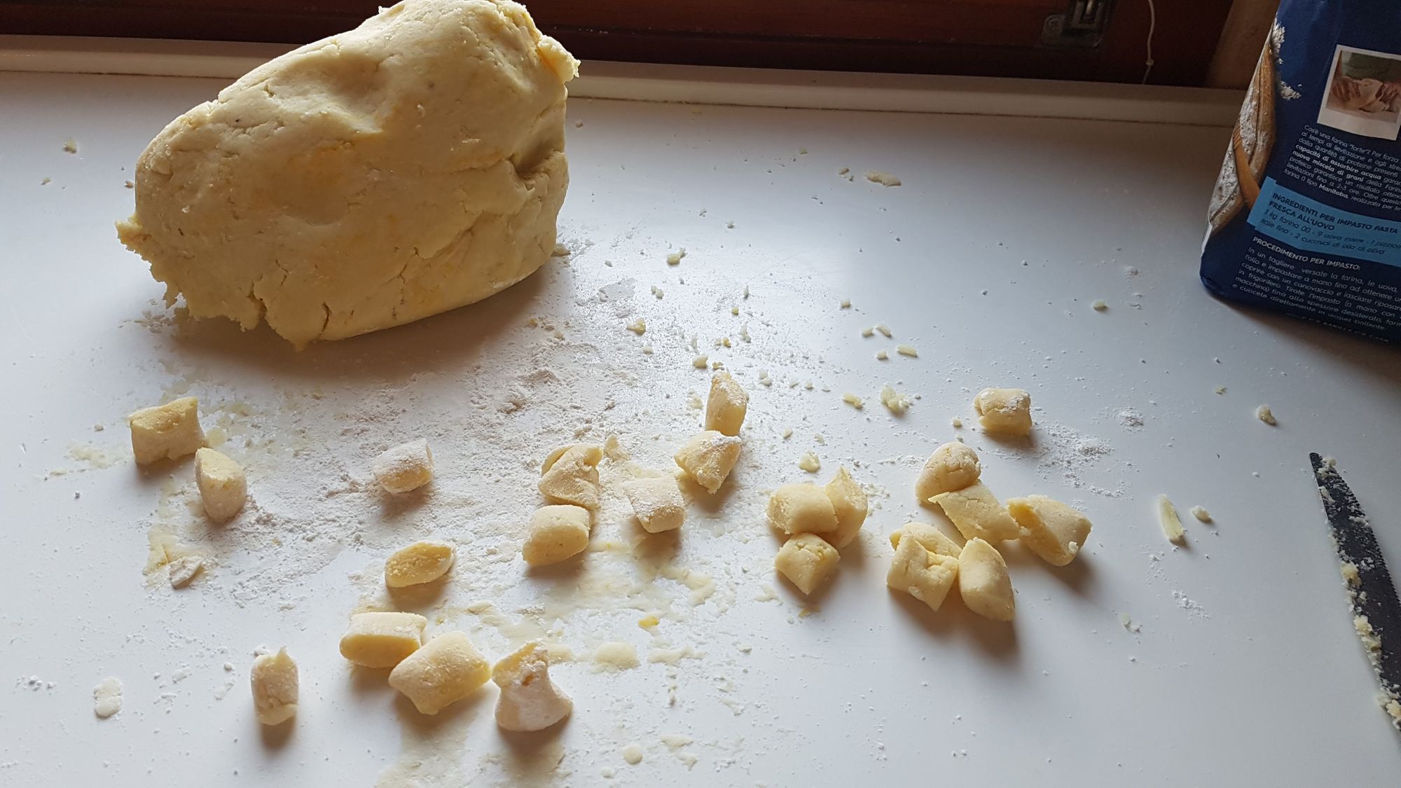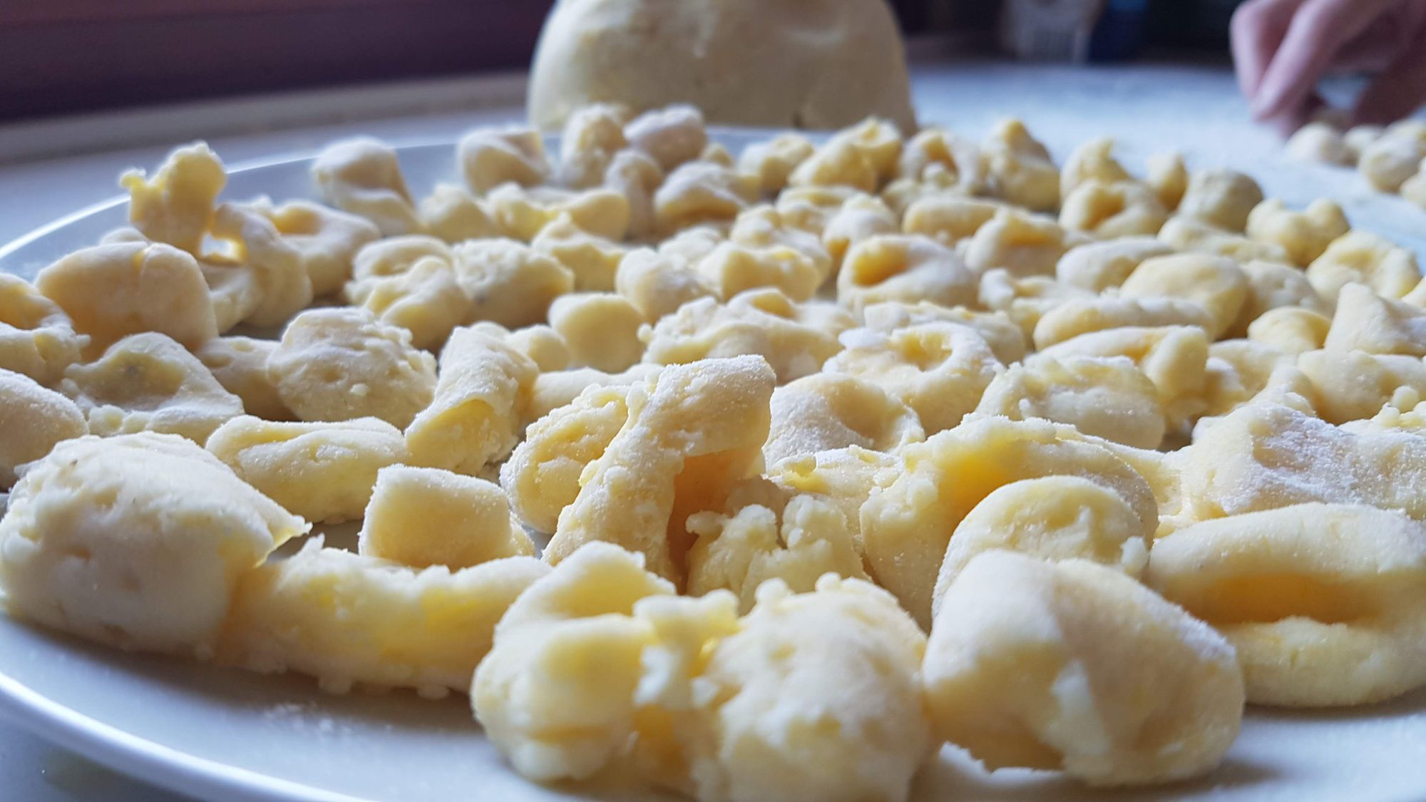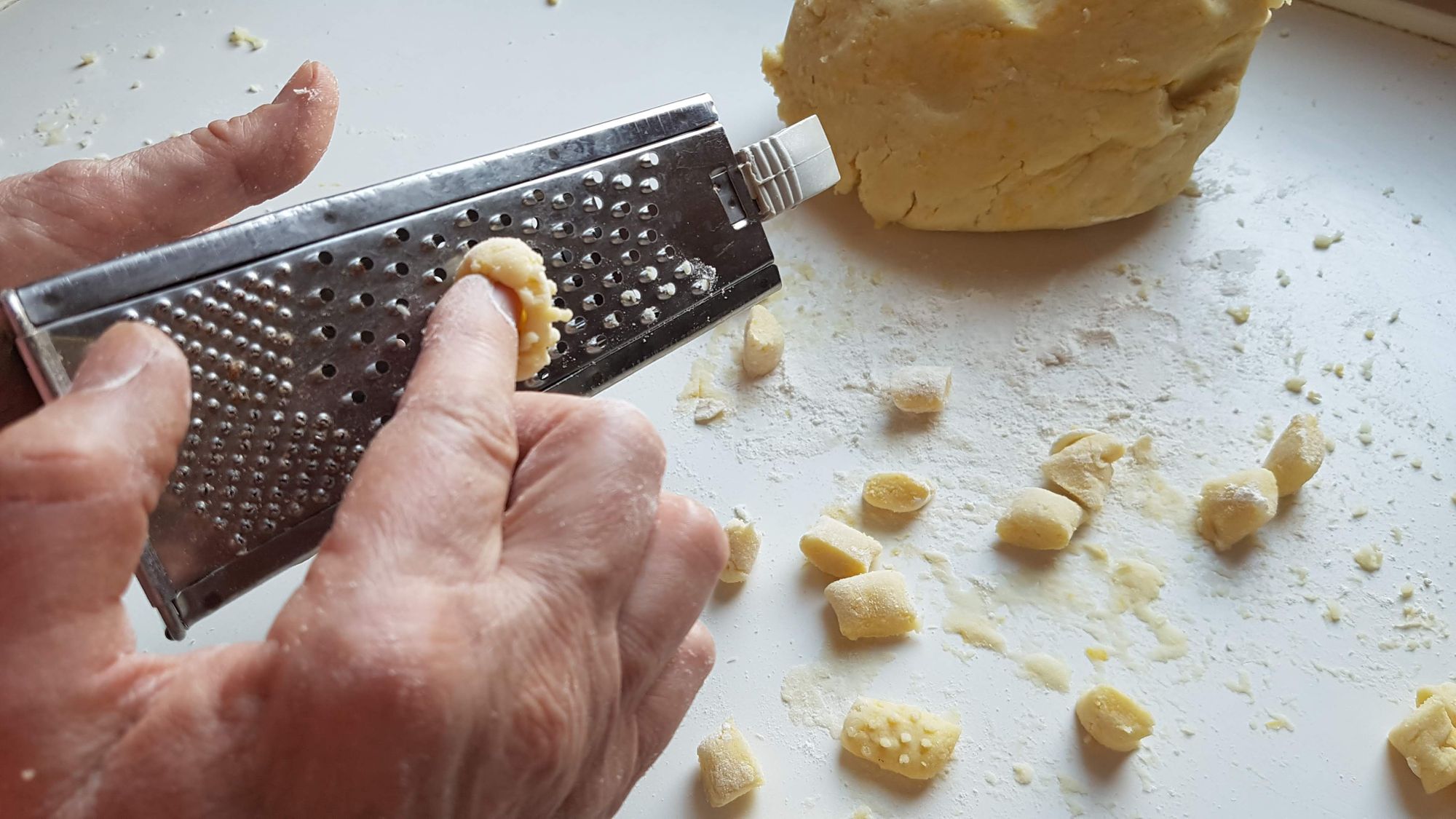 L'insieme degli ingredienti va manovrato con una certa forza in modo da ottenete una palla che dividerete per ricavarne dei "salamini" del diametro da circa 2 cm. che a loro volta andranno tagliati per ricavarne delle parti da circa 2 o 3 cm. A questo punto van leggermente pressati sulla grattugia per renderli scavati da una parte e ruvidi dall'altra. Così fatti tratterranno maggiormente il sugo.