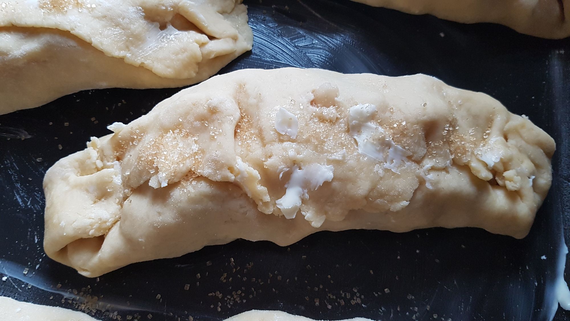 Decorate superiormente lo strudel con del burro morbido e zucchero sciolti nel latte e ripetete questa operazione anche più volte durante la cottura.
