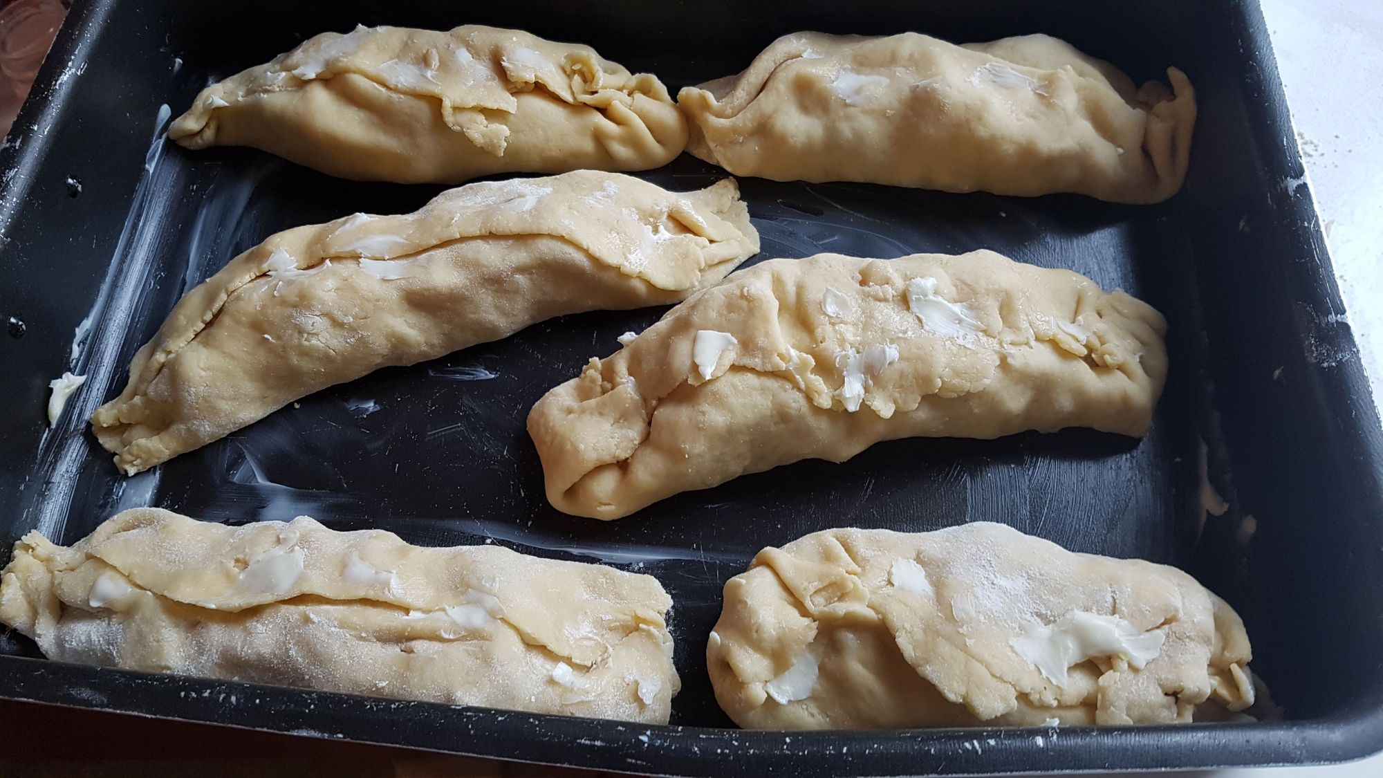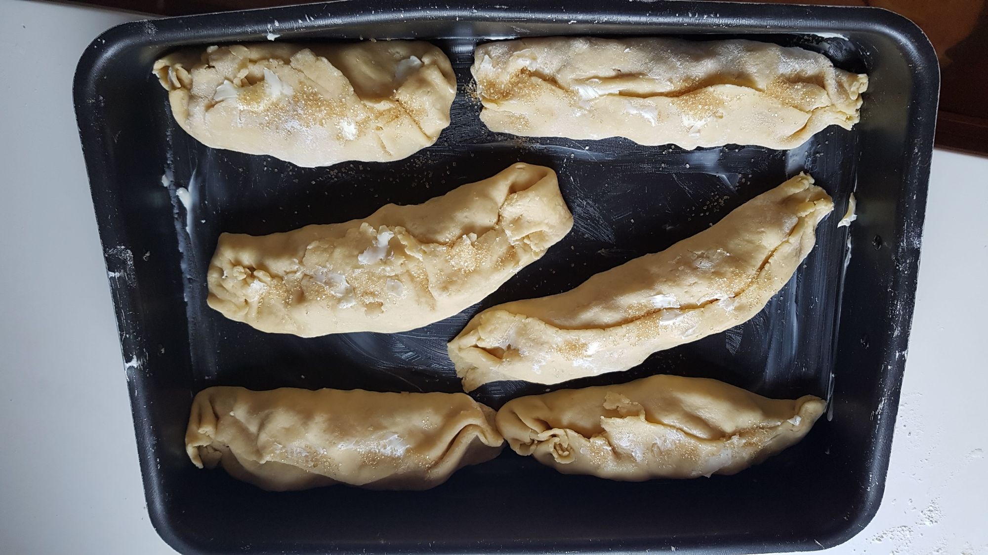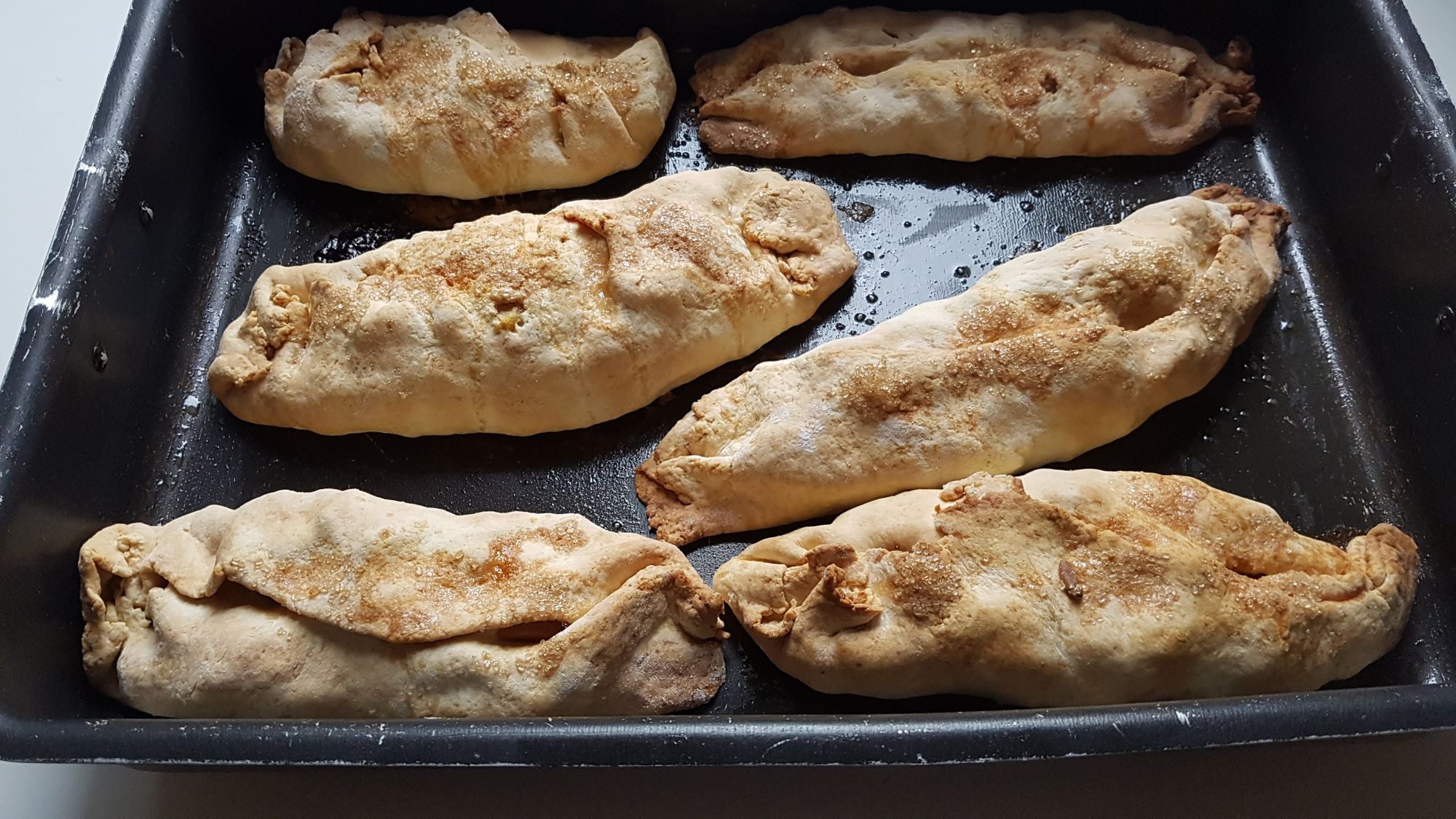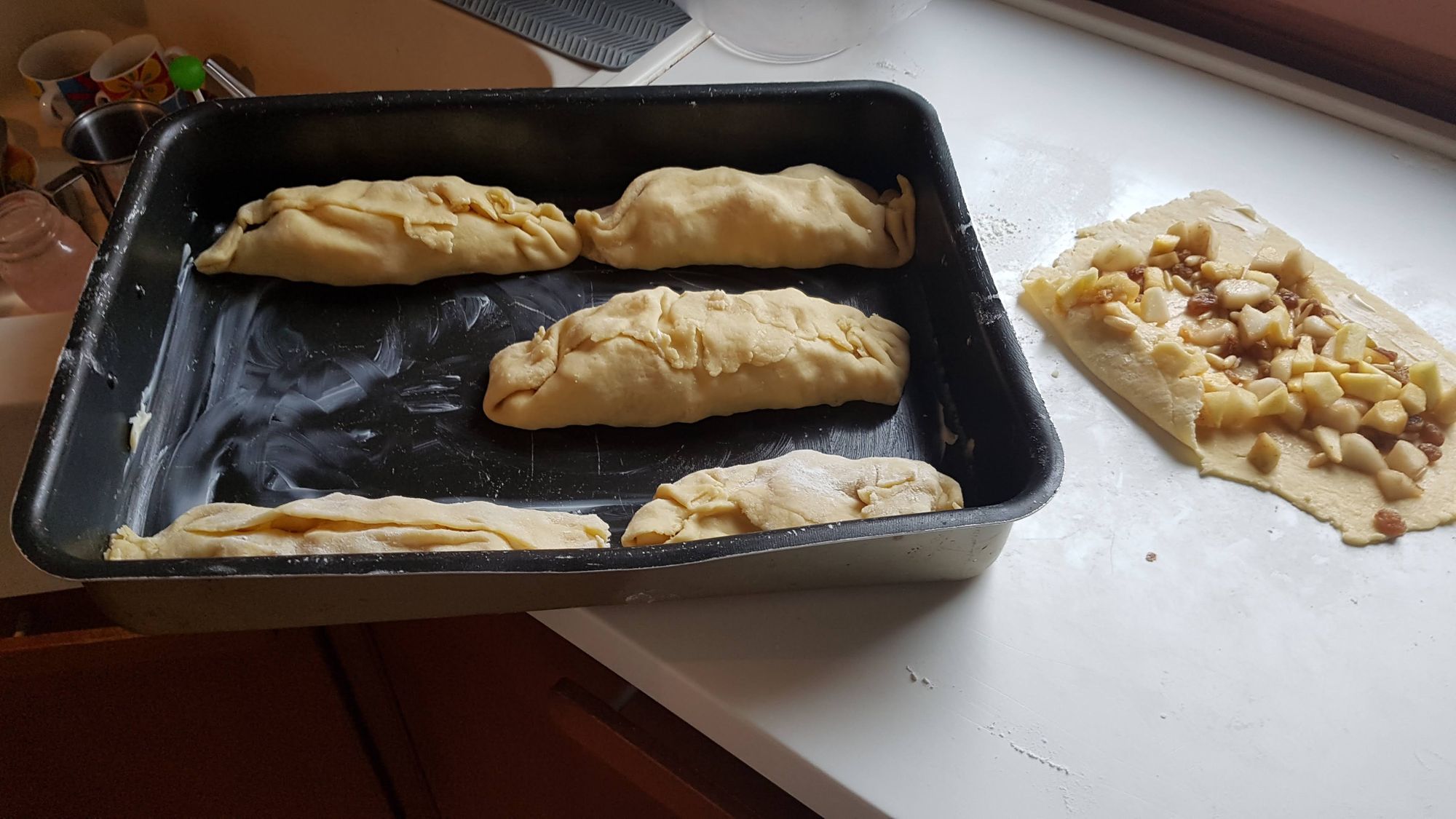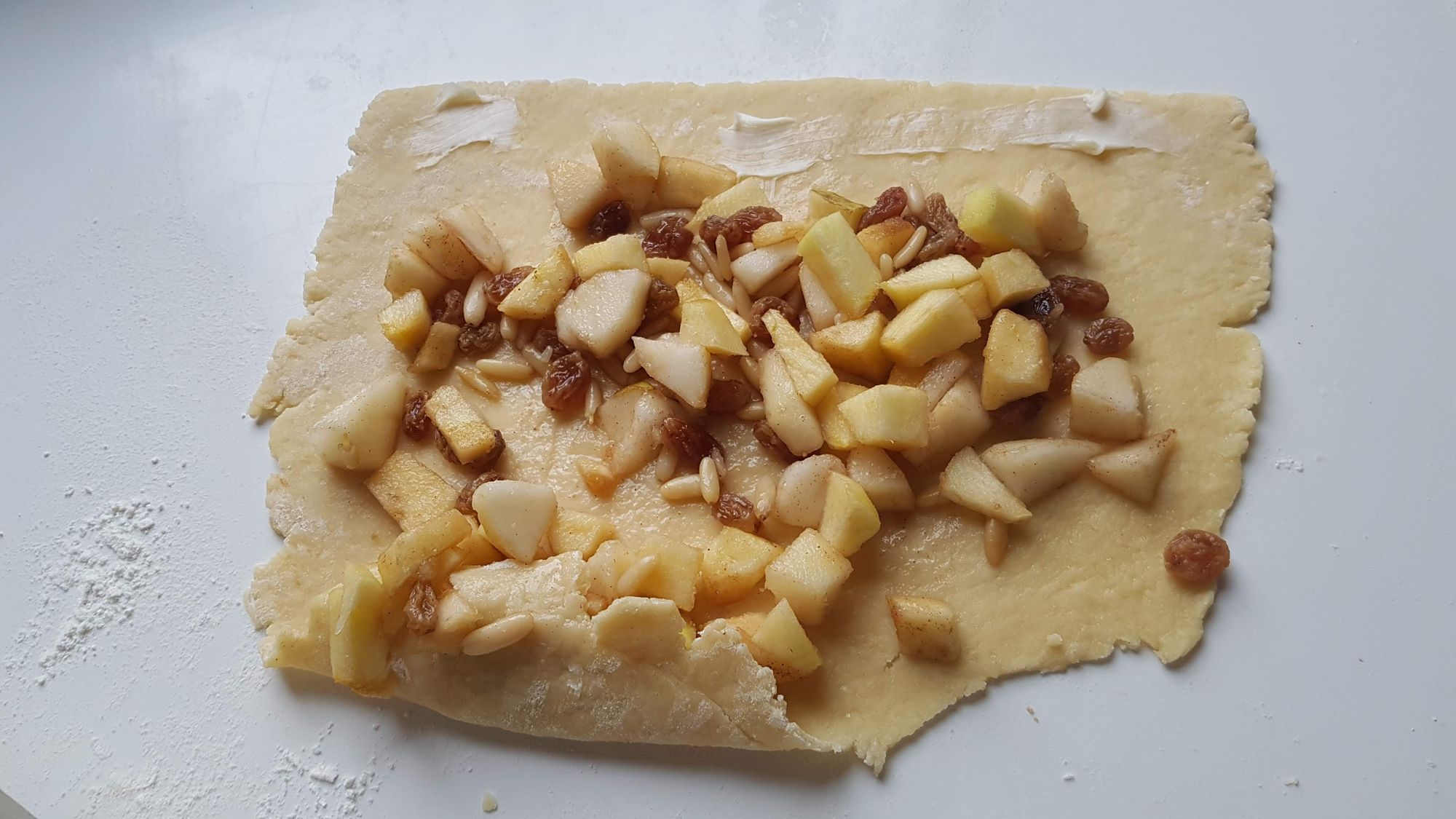 Disponete sulla sfoglia, di forma quadrata o rotonda, il composto di frutta ed arrotolate in modo che vi sia una sovrapposizione di pasta per chiudere il dolce. Insistete nella chiusura delle parti laterali e controllate che non si apra superiormente.