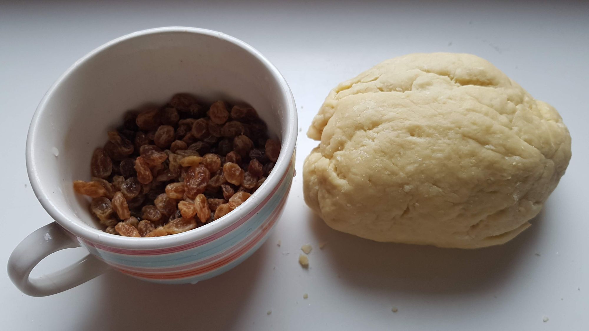 Per prima cosa si deve ammollare l'uvetta e in seguito procedere con la pasta. Quando questa si riposa si prepara la frutta.