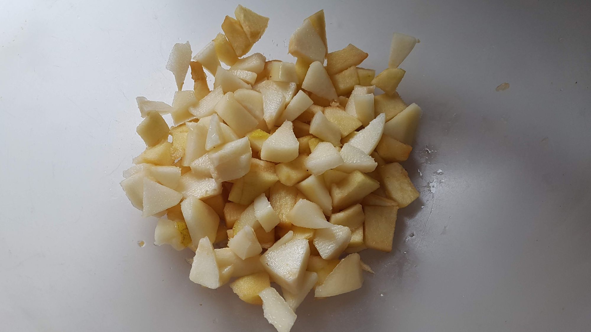 In una terrina mettete circa mezzo chilo di pere o mele o un misto di queste due tipologie di frutta tagliuzzate, l'uvetta che nel frattempo avrete fatto rinvenire nel rum, i pinoli e spolverizzate con la cannella. Dopo aver messo il burro fuso e lo zucchero mescolate la "macedonia"