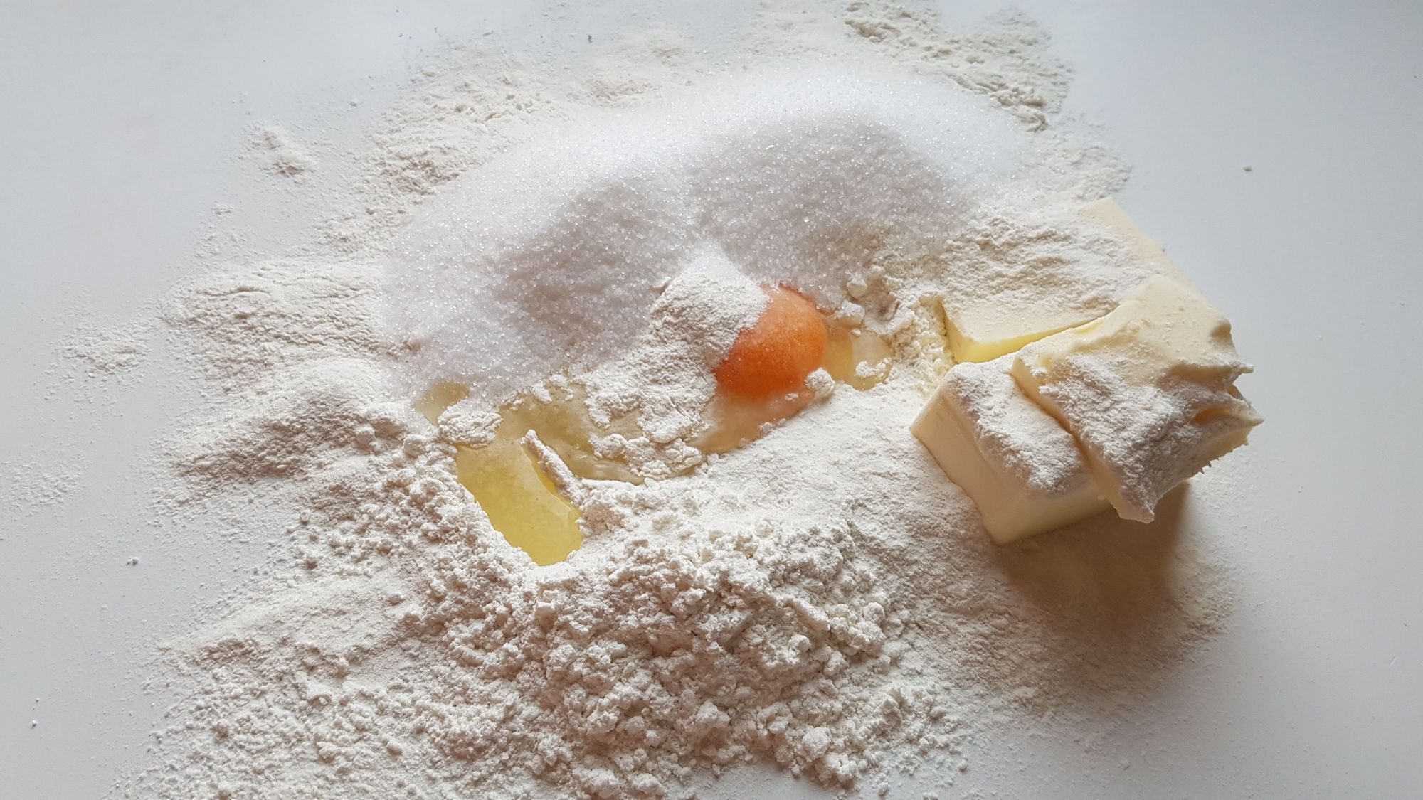 Per la pasta: Sulla spianatoia mettete il burro ed il sale. Amalgamate 150 gr. di zucchero, un uovo intero ed un tuorlo, 300 gr. di farina e la scorza di limone.
