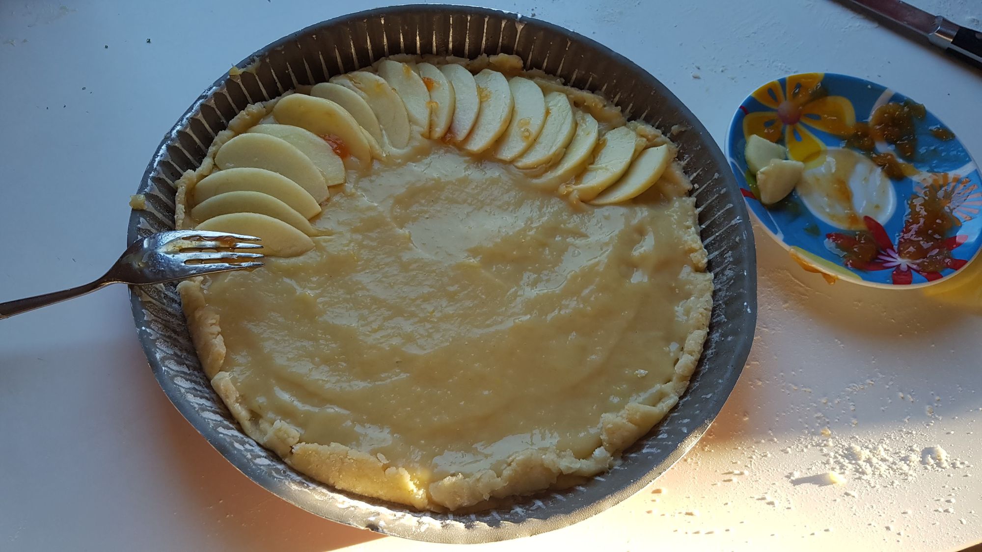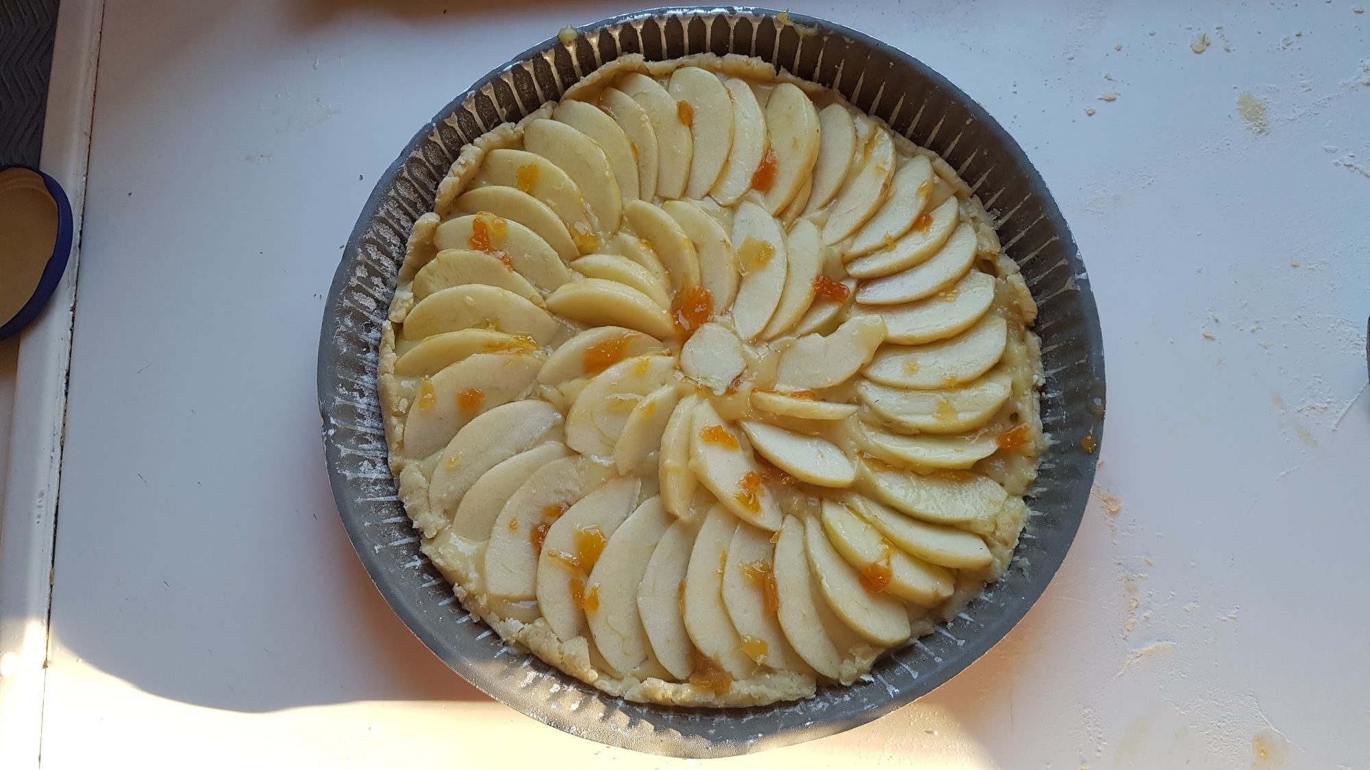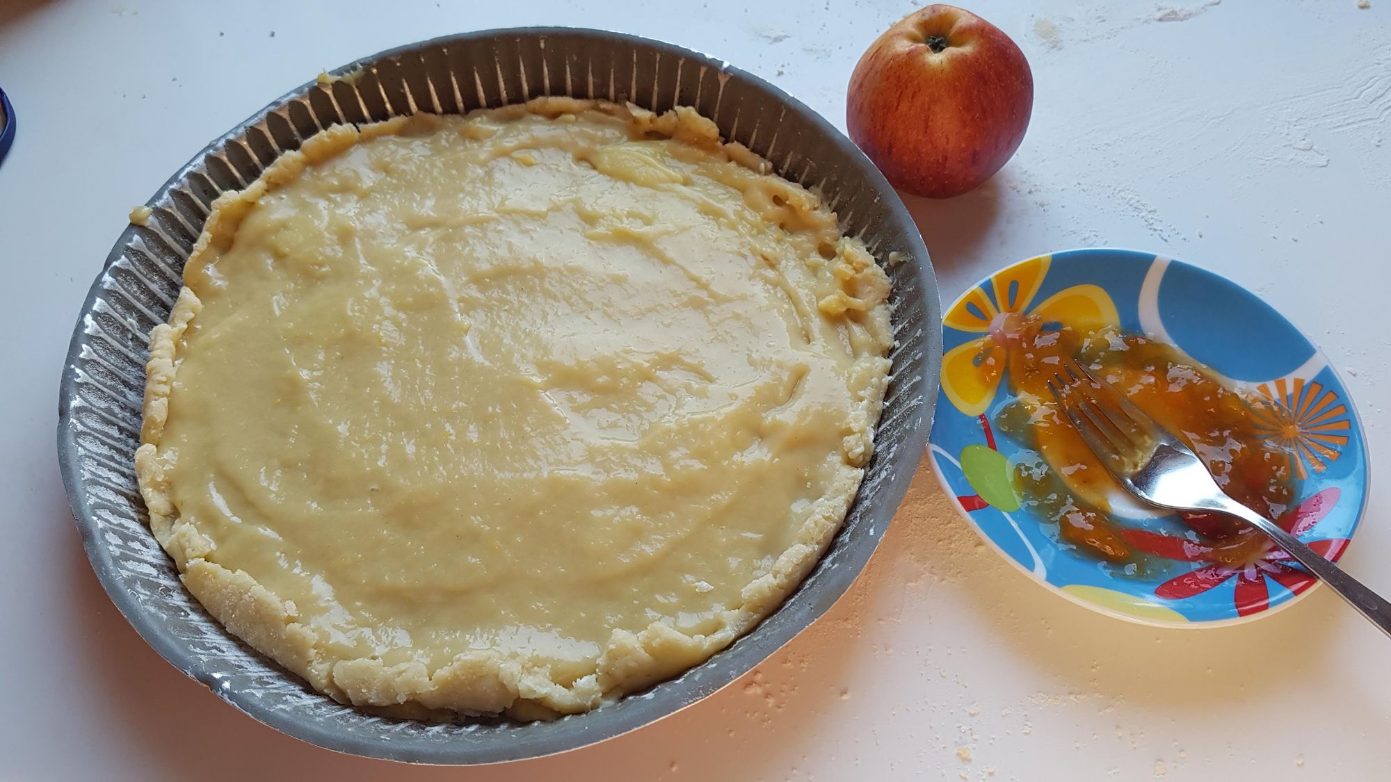 Versatevi sopra la crema. Disponete le mele e guarnite con la marmellata in modo che, in cottura, si formi una pellicola dolce.
