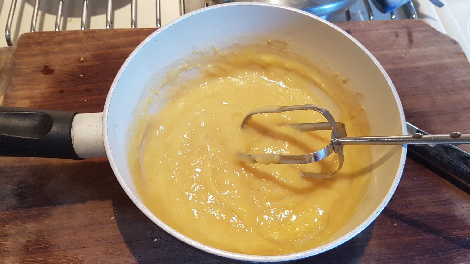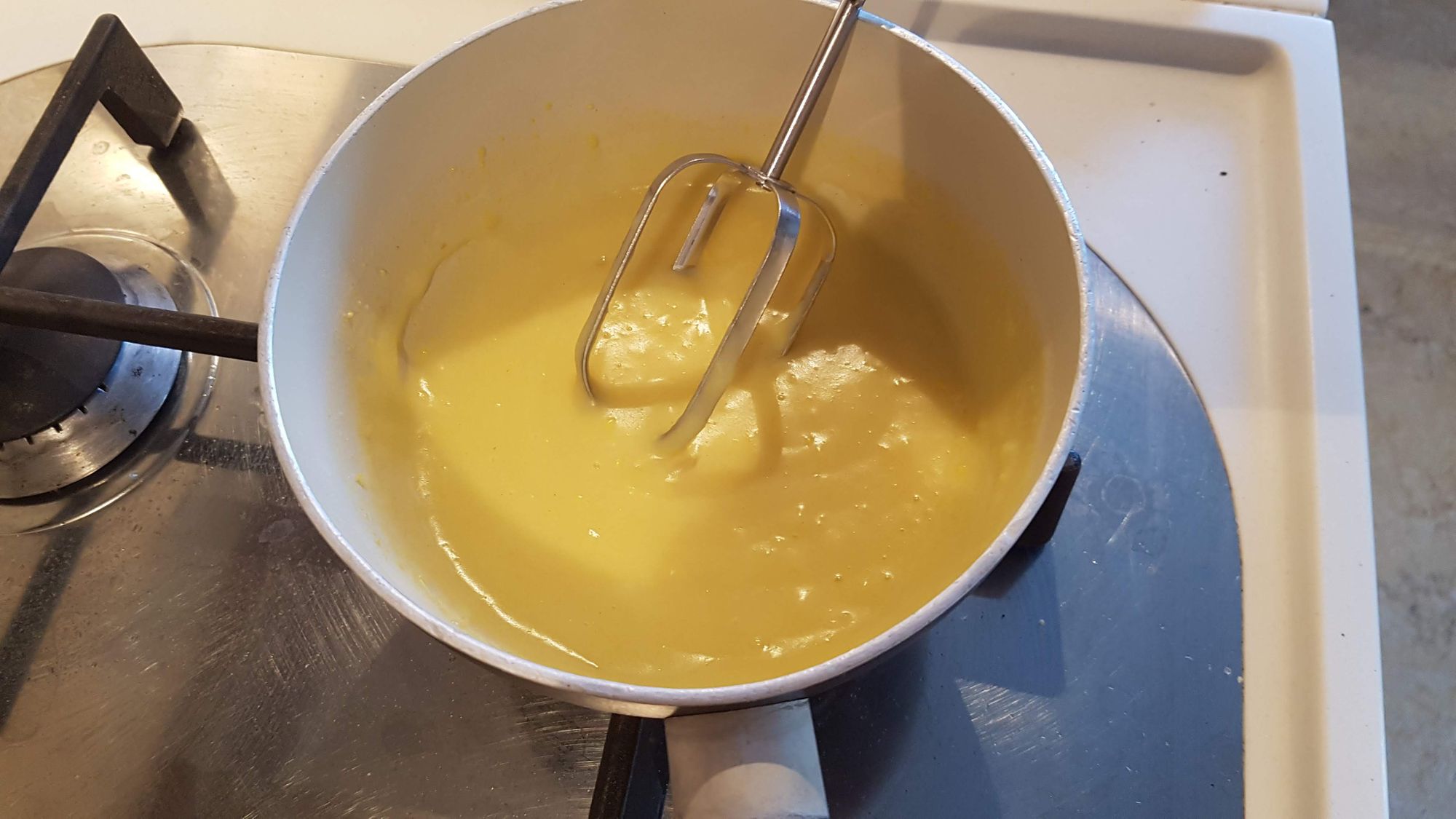 Per la crema: Nel frattempo, mentre la pasta riposa, in una casseruola mettete gli altri due rossi d'uovo, 50 gr. di zucchero, 50 gr. di farina ed il latte. Fate cuocere a fuoco lento fino a che non addensa sempre mescolando. Fate raffreddare e quando la temperatura lo consente aggiungete il vino marsala che non deve "scaldarsi".